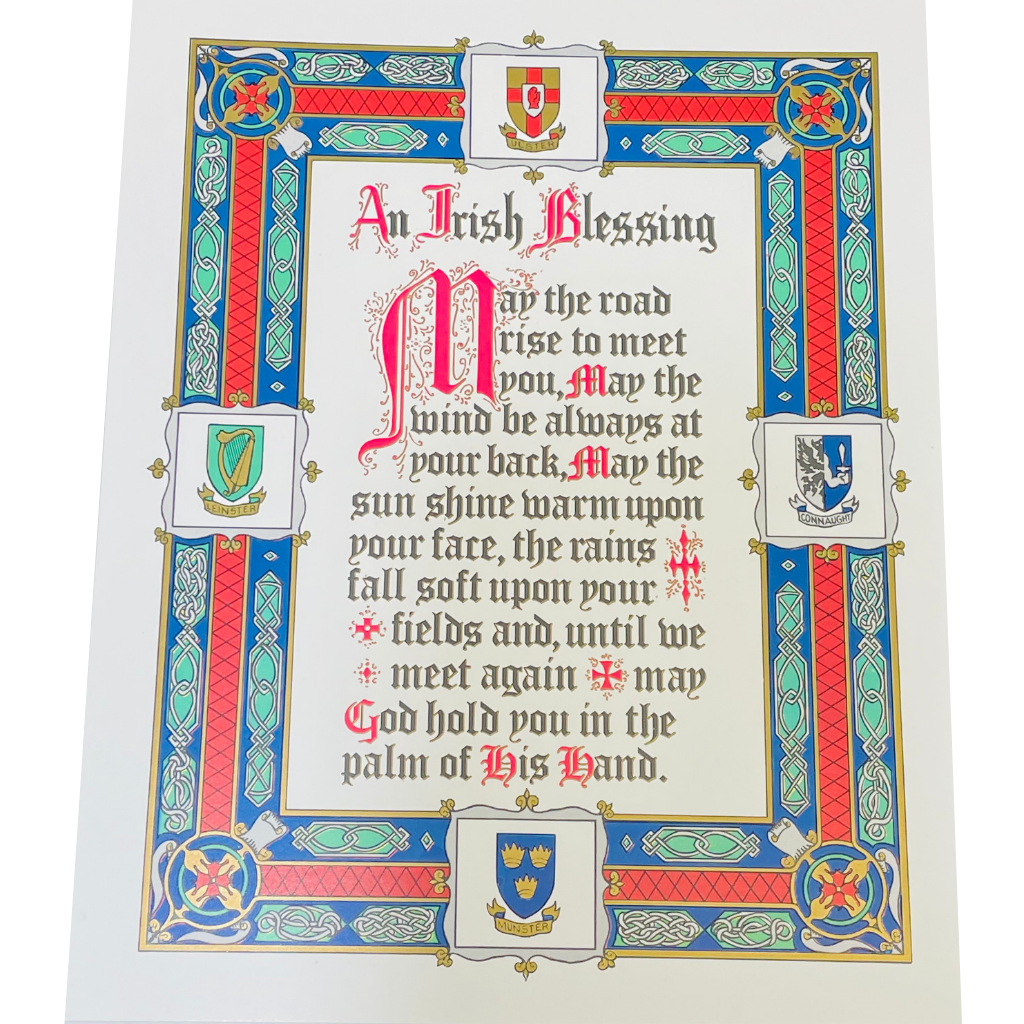 This is an 8″ by 10″ print of St. Patrick’s Irish Blessing, written in calligraphy with gold accents. Suitable for framing.