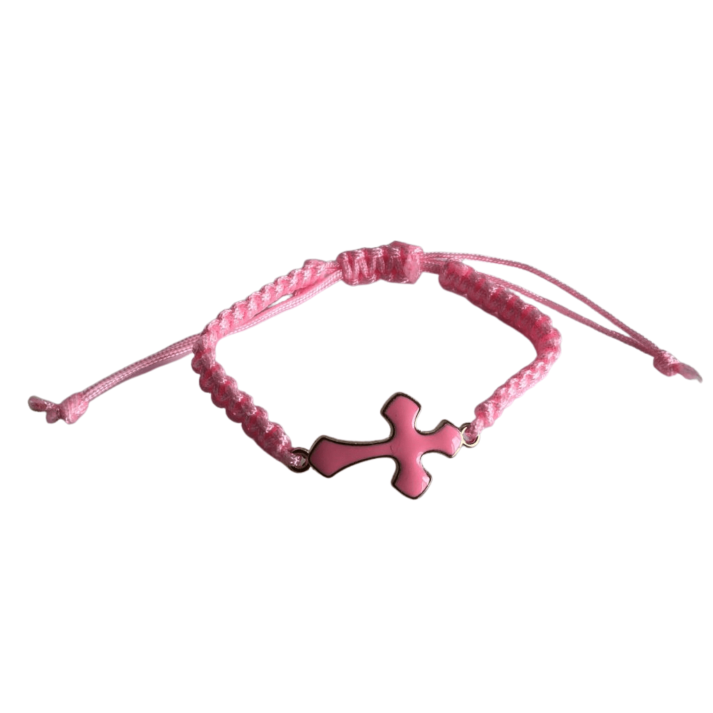 This bracelet comes with a gold cross enameled in pink.  The pink corded bracelet utilizes a drawstring to ensure a good fit.  The bracelet is sized for an adult or older child.