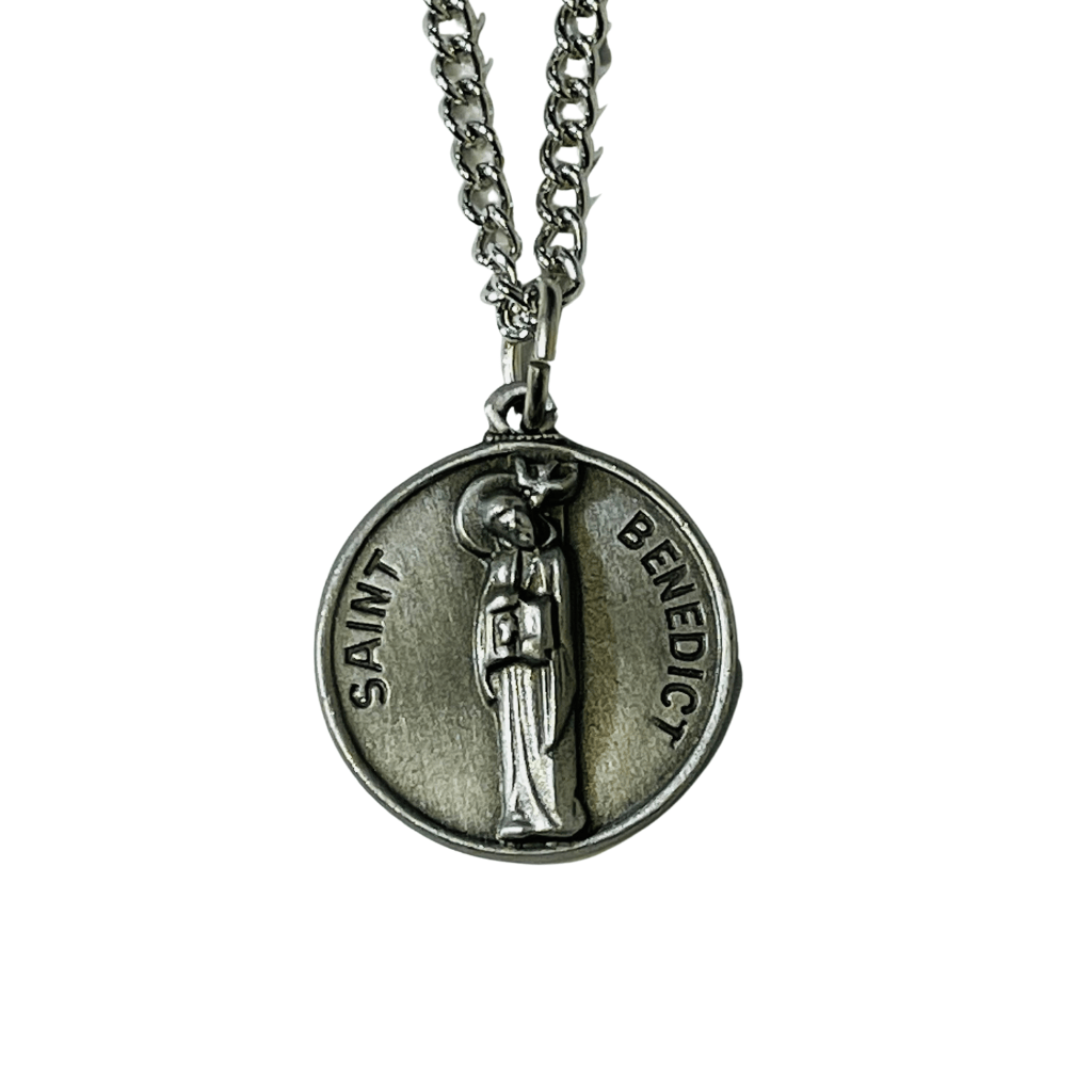 This 3/4″ St. Benedict pewter medal already comes on a chain. The edge of the medal is inscribed “Saint Benedict”. To clarify, this is a medal of the image of St. Benedict.